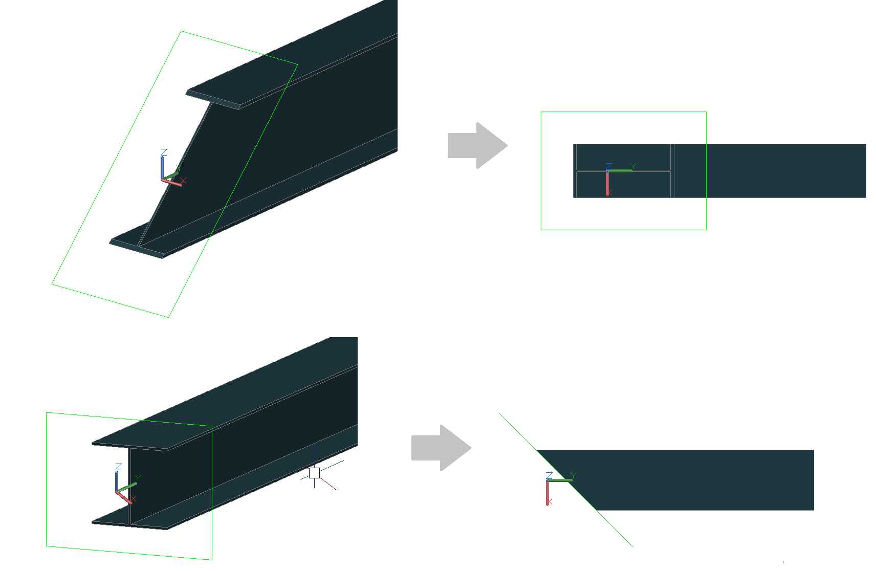 In the examples below, the first image shows a top view with a shortening created straight against the view. This means that the necessary view condition is not fulfilled. The second image shows the top view with a shortening that is skewed against the view. This means that the necessary view condition is fulfilled and Advance Steel will automatically create a top view on the detail drawing.
