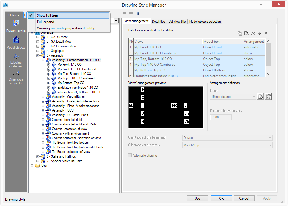 A context menu provides quick access to the management functions available for the selected element (drawing style, view, model object, etc.).