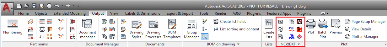 The NC specific commands are located on the Output tab > NC&DXF panel: