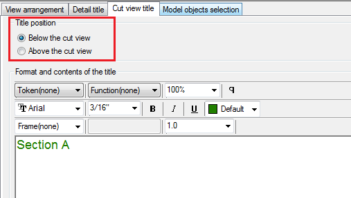 The cut view title configuration page offers the option to control the position of the cut view, and the title content, using a standard text editor.