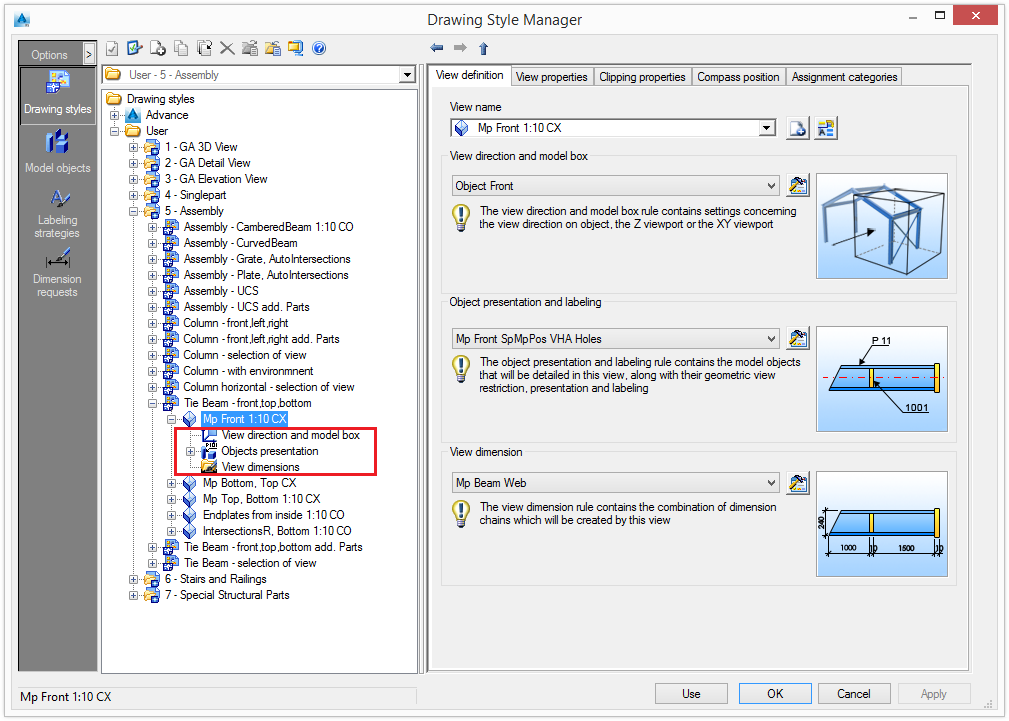 - View direction and model box - Select how to look at the objects in the model (e.g., front, top, left, etc.) and the options for the viewport definition.