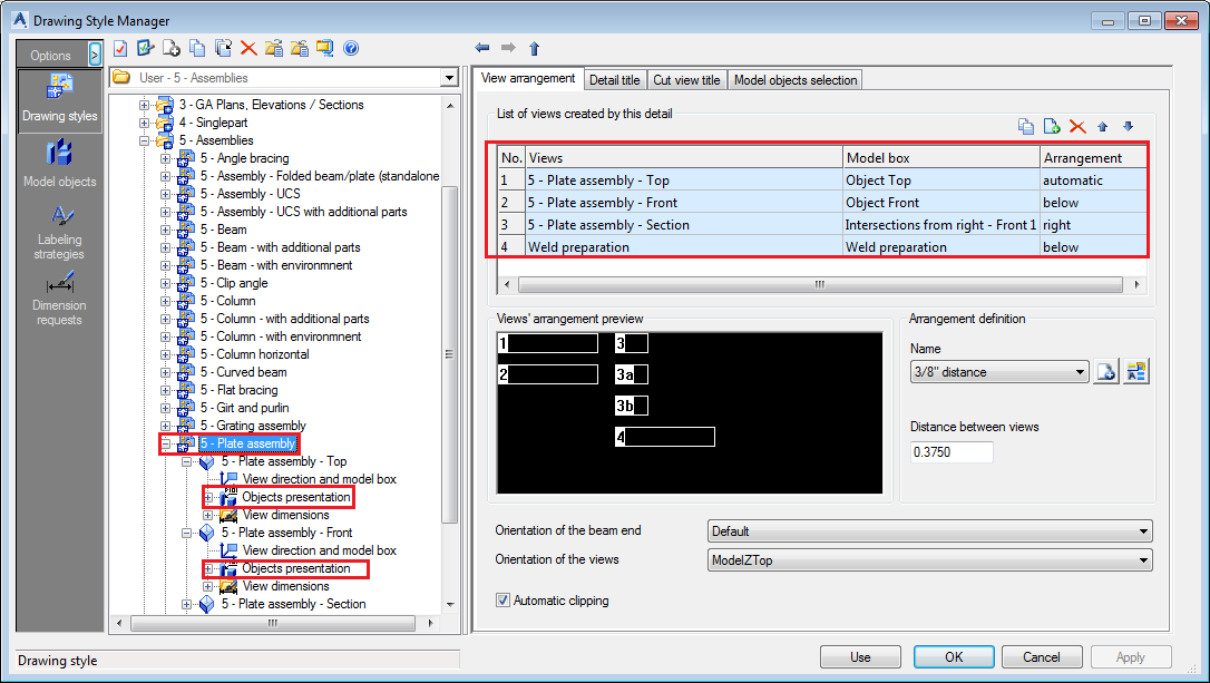 Selected model objects, presentation and labeling strategies are core settings which directly communicate with Advance Steel, while the upper settings in the tree are saved rules that reuse certain configurations. Editing any settings of an existing drawing style requires a set of copies of the rules that are above that respective setting, including the drawing style itself.