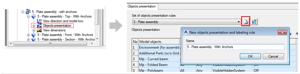 (Add a new object presentation). This will add a new line at the bottom of the list, containing values copied from one of the existing entries (generally the first line is copied). The object presentation rule will contain a duplicate entry. The new line will store the necessary modifications to add the anchor object to the plate drawing style. You can reuse existing configurations to add the anchor as they are core settings which do not require a copy.