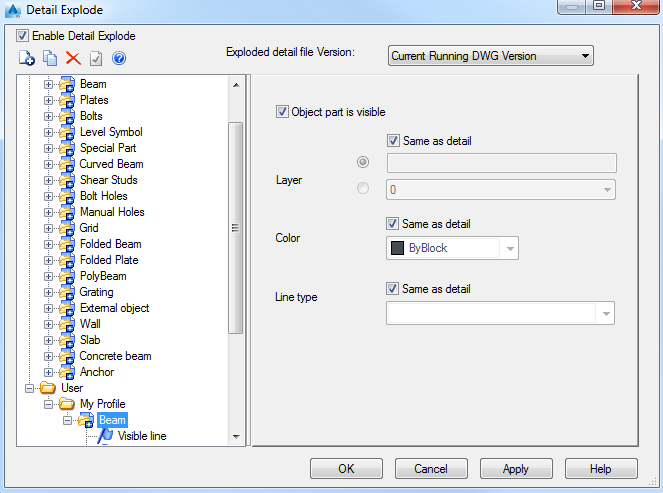 Enables the Detail Explode Settings. While exploding the details, for each object or sub-object a corresponding setting will be searched in the Current Profile. If there is no setting, the explode settings will be used from Advance Steel category.