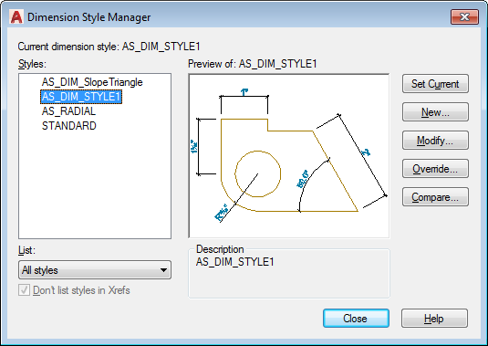 Dimension styles. Each different type of dimension (linear, arc, radial, angle and slope triangle) has its own dimension style specific default value. Multiple dimension types can use the same dimension style:
