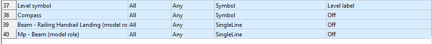 Once an object is detailed by a line, then it will not be detailed by other lines after it - even if the rule matches the object. For example, if at position 20 you have a rule detailing all beams, regardless of their numbering type or model role, then the rule we configured at position 40 to detail the beams with the Beams model role and a blue single line will be ignored. However, if you move the new rule ahead of the 20th line, then Advance Steel will detail all beams with the model role Beams, using the dedicated presentation rule, and when it reaches position 20 it will detail the rest of the beams (that don't have the Beam model role) with the respective object presentation.