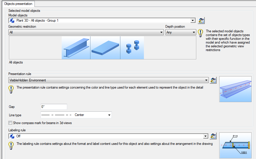 In the object presentation page, for each line associated to a model object - the filter that has the role to detail a specific object from the model - with an object presentation - the style, line-type and color used by Advance Steel to detail the object, there is also a column that can be associated to a labeling strategy.