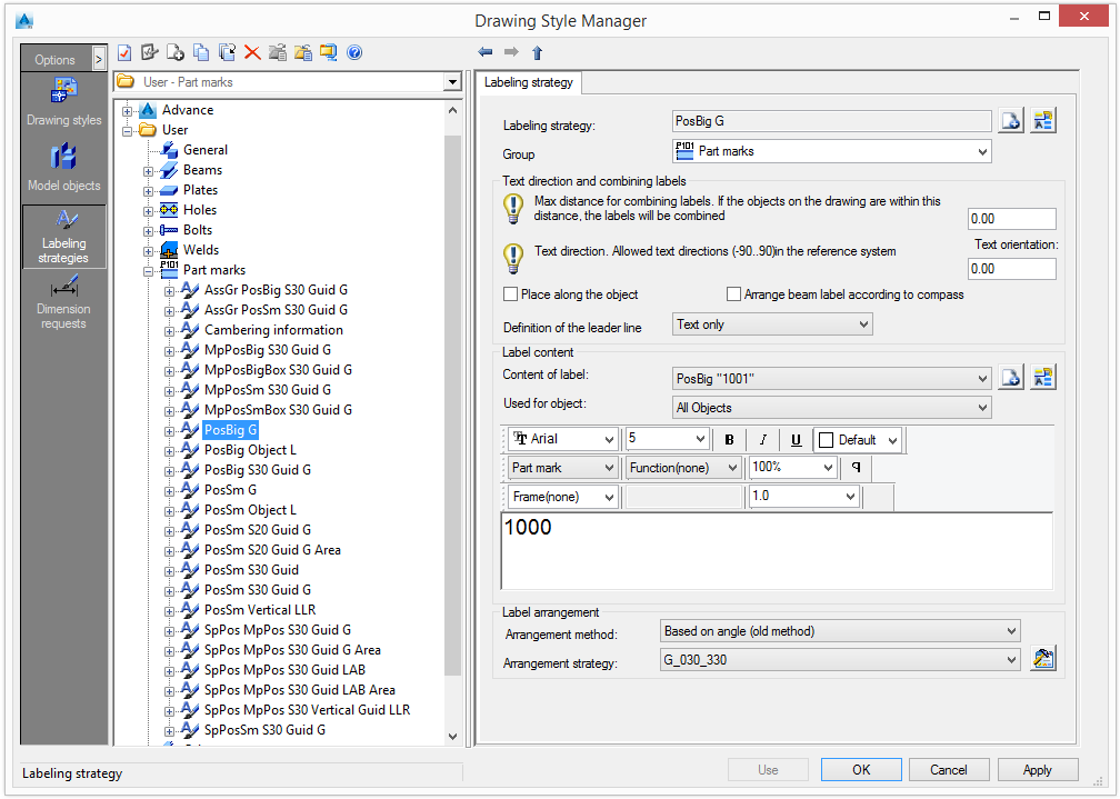 In the tree panel, model objects are grouped by Advance object: Bolts, Beams, Welds, etc. A small image depicts the content of the group. All the management functions refer to the labeling strategies.