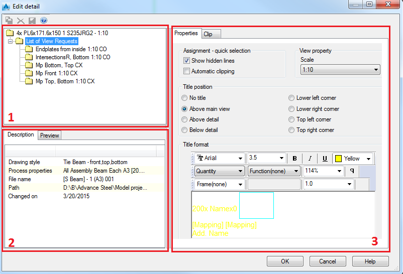 The properties of the selected view are displayed in the right side of the dialog window. By selecting List of View Requests, the title text and other properties are defined for the whole detail.