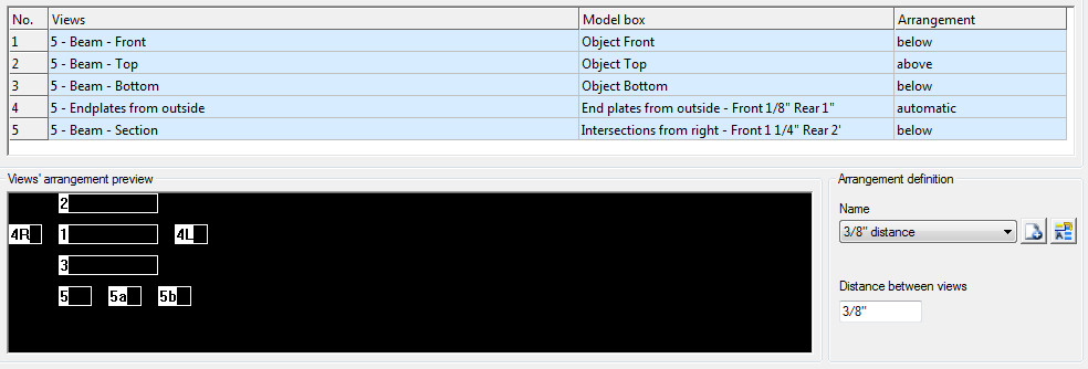 For example, in a beam drawing style, the top view can be arranged at the top, but when considering the same beam drawing style for a column with a vertical layout, the same top view will be placed to the left of the main view arranged on the left setting. The schematic preview below the view list determines where each view will be placed in relative position to the main view: