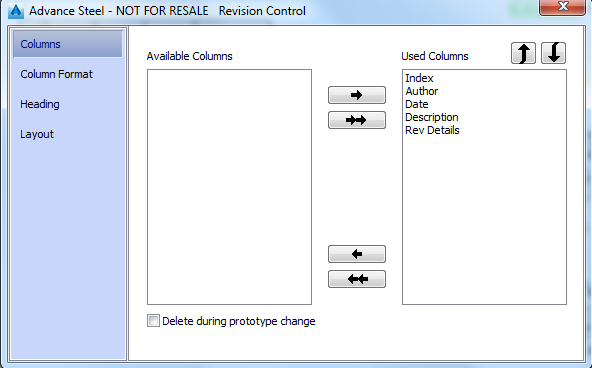 Displays the list of the columns that may appear in the revision table.