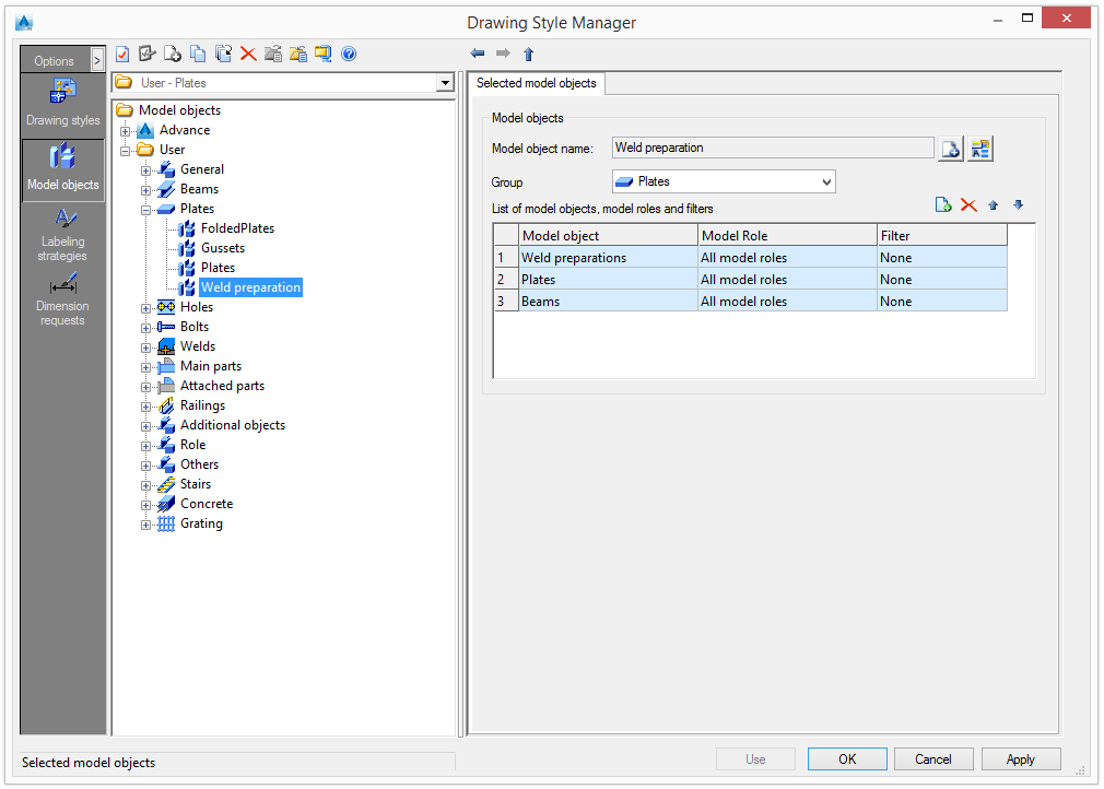 Model objects act as filters for objects from the 3D model. A model object is defined by the Advance object type (e.g. Beam), model role (e.g. Column) and an additional filter (e.g. with holes).