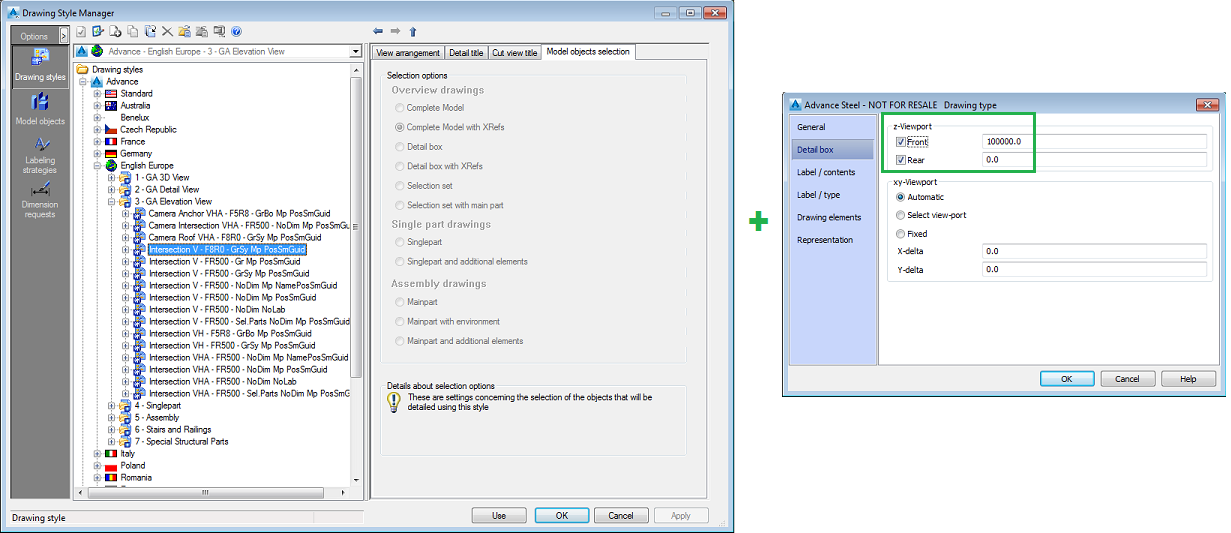 - In case of a partial overview that has been created using a drawing style that uses the Complete model or Complete model with Xrefs options in Model objects selection (from the Drawing Style Manager), bills of material created on this view will contain all the objects from the model, not only the ones included in the Detail box.