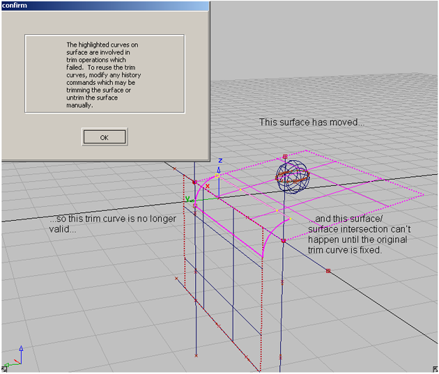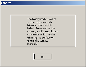 You may also see this message if you have performed a trim operation on curves created by projecting or intersecting curves or surfaces. The usual cause of the problem is that one of the initial surfaces (or curves) used to create the trim curve or secondary surface has been moved, resulting in a trim curve on one of the initial surfaces that no longer isolates an area that can be trimmed, and this has been diagnosed when you are attempting to create a new trim on the surface.