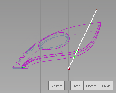 The Trim tool can be used to create a curve-on-surface directly from a projected curve before trimming the surface. Now use the curve you have drawn to cut away the front end of the surfaces.