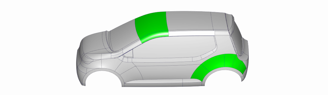 This example shows the outline curves for the side windows. They were first created to the 'theoretical' intersections, before the transitions were applied for the final design.