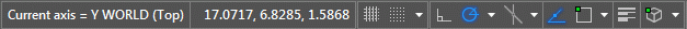 The default active axis is the X axis. The active axis is shown by a broken line extending from the UCS icon origin. To rotate the UCS about the active axis, click and drag the screen pointer perpendicular to the axis. The first pane of the mode status line reports both the active axis and the current rotation, relative to the current orientation.
