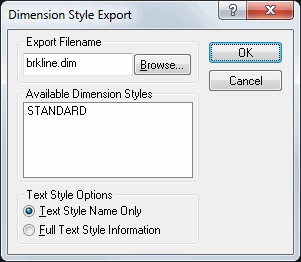 | Available Dimension Styles | Selects the dimension styles to write to the ASCII file. The current dimension styles are displayed. Each selected style is written to the file indicated in the Export Filename group. |