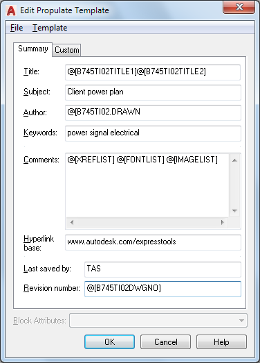 | @[block.attributeTag] | Extracts the attribute tag value from an attributed block and inserts it in the specified field.For example: inserting @[title.drawnby] in the Author field causes Propulate to search the drawing for an attributed block named title, extract the value of the drawnby attribute field, and insert that value in the Author field of the drawing's Drawing Properties dialog box. If common blocks are used across a project it is a simple matter to update a large number of drawings to reflect their specific attribute values. |