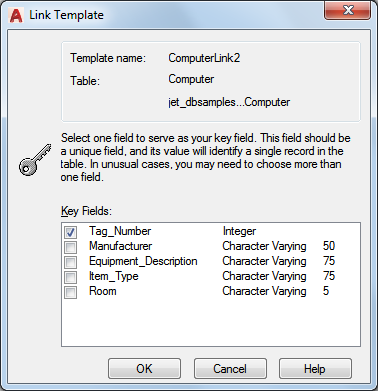 Displays all fields that are available for the current database table, as well as the field type and, in the case of character fields, the field length. You specify the link template's key fields by selecting the check box to the left of the field name.