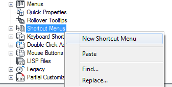 - In the Customize tab, Customizations In <file name> pane, right-click the Shortcut Menus node. Click New Shortcut Menu.