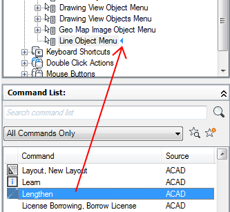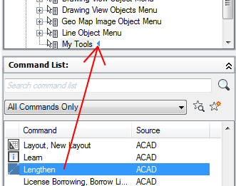 - In the Command List pane, drag the command that you want to add to the shortcut menu in the Customizations In <file name> pane.