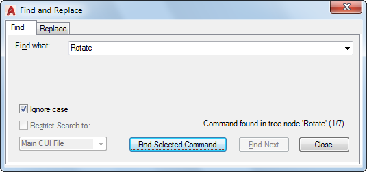 2. In the Find and Replace dialog box, Find tab, click Find Selected Command to search for the first instance of the command.