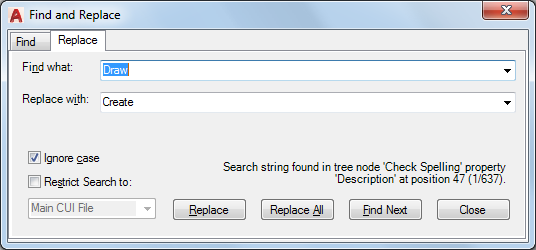 Note: You cannot undo the replacement of a string value. If you do make an error, close the Find and Replace dialog box and cancel out of the Customize User Interface (CUI) Editor and try again.