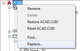 1. In the Customize tab, Customizations In <file name> pane, right-click anywhere in the tree view. Click Replace.