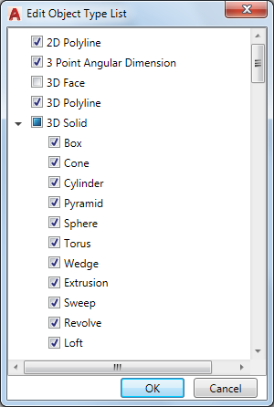 - In the Edit Object Type List dialog box, click the object types you want to display properties for on the Quick Properties palette.
