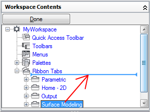 - In the Workspace Contents pane, click the plus sign (+) next to the Ribbon Tabs node to expand it.