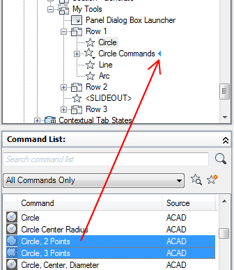 - Drag and drop a control from the Command list to a row in the ribbon panel.