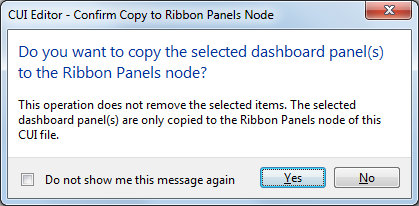 - In the CUI Editor - Confirm Copy to Ribbon Panels Node dialog box, click Yes.