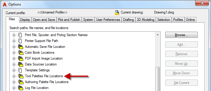 Tool palette files contain standard and user-defined tools. The files are stored in the locations specified by the Tool Palettes File Locations setting.