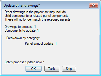 The Update Other Drawings dialog box displays. This dialog alerts that other drawings in the project set include child components or related panel components.
