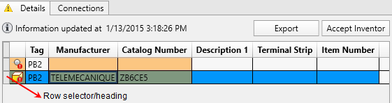 Click the row selector (heading) to select the entire row for your AutoCAD Electrical component.