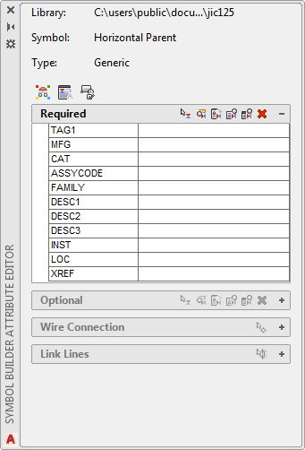 Add the attributes TAG1, DESC1, LOC, INST, FAMILY, MFG, CAT, and ASSYCODE to the custom symbol.