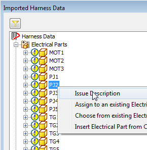 The browser nodes in the Imported Harness Data dialog box contain the electrical components and wires imported from AutoCAD Electrical.