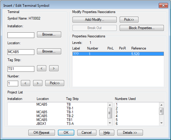 Select below wire at line reference 535 (2), left click to end command, right-click to add terminal