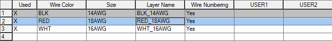 The Change/Convert Wire Type dialog box lists all the valid wire layers that are defined for the active drawing. The wire layer name and the wire properties like color, size, and user-defined properties are listed in the grid. An “X” in the Used column indicates the layer name is currently being used.