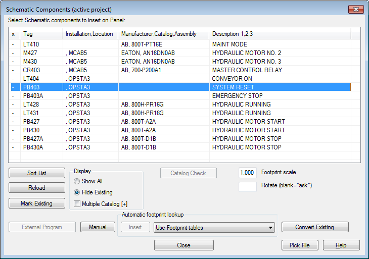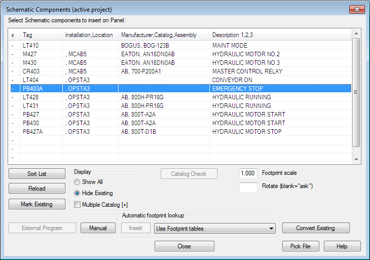 In the Schematic Components (active project) dialog box, select: PB403A OPSTA3 EMERGENCY STOP.