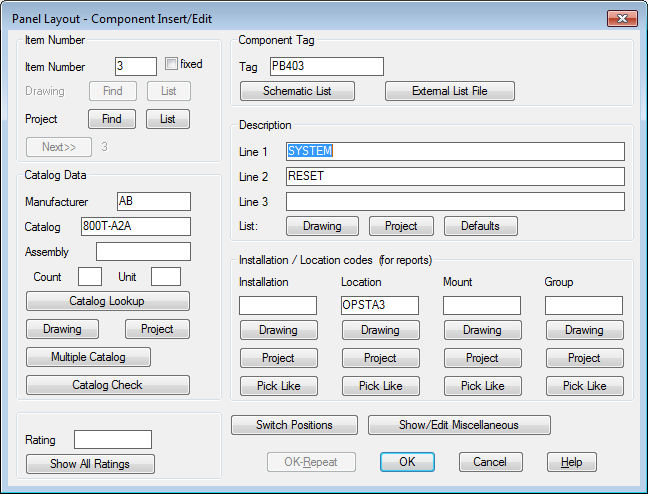 The component may already have an Item Number assigned. If AutoCAD Electrical finds a component with the same catalog information, it automatically assigns the same item number to this new component. If no item number is assigned, and you think a matching component exists, use one of the Find buttons to look through the drawing or project. If no matching component is found, click Next to assign an item number to this footprint. This button updates each time you insert a footprint and assign an item number. This item or detail number is used for BOM and component reporting and can be referenced by optional balloon labels tied to the footprint. If you do not want the item number to change if Resequence Item Numbers is run later on, check fixed next to the item number.
