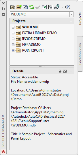AutoCAD Electrical is a project-based system. An ASCII text with a .wdp extension defines each project. This project file contains a list of project information, default project settings, drawing properties, and drawing file names. You can have an unlimited number of projects; however, only one project can be active at a time.