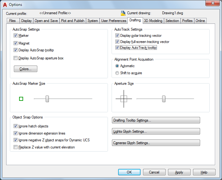 Controls the settings that relate to AutoTrack ™ behavior, which is available when polar tracking or object snap tracking is turned on (see DSETTINGS).