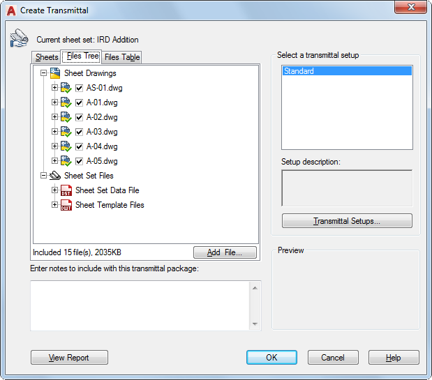 Lists previously saved transmittal setups. The default transmittal setup is named STANDARD. To create a new transmittal setup or to modify an existing one in the list, click Transmittal Setups.