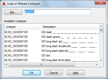 Displays the name of the current LIN file. You can enter the name of another LIN file or click the File button to select a file from the Select Linetype File dialog box.