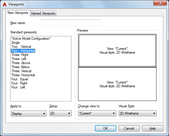 Specifies either a 2D or a 3D setup. When you select 2D, the new viewport configuration is initially created with the current view in all of the viewports. When you select 3D, a set of standard orthogonal 3D views is applied to the viewports in the configuration.