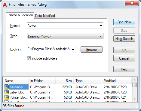 The type of files to include in the search is determined by Type, so you don't need to enter a file extension in Named. For example, to find house102.dwg, enter house* and set Type to Drawing (*.dwg).