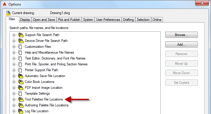 Tool palette files contain standard and user-defined tools. The files are stored in the locations specified by the Tool Palettes File Locations setting.