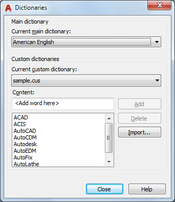 Manages dictionaries. During a spelling check, the words in the drawing are matched to the words in the current main and current custom dictionaries. Any spelling exceptions that you identify with the Add option are stored in the custom dictionary you are currently using.